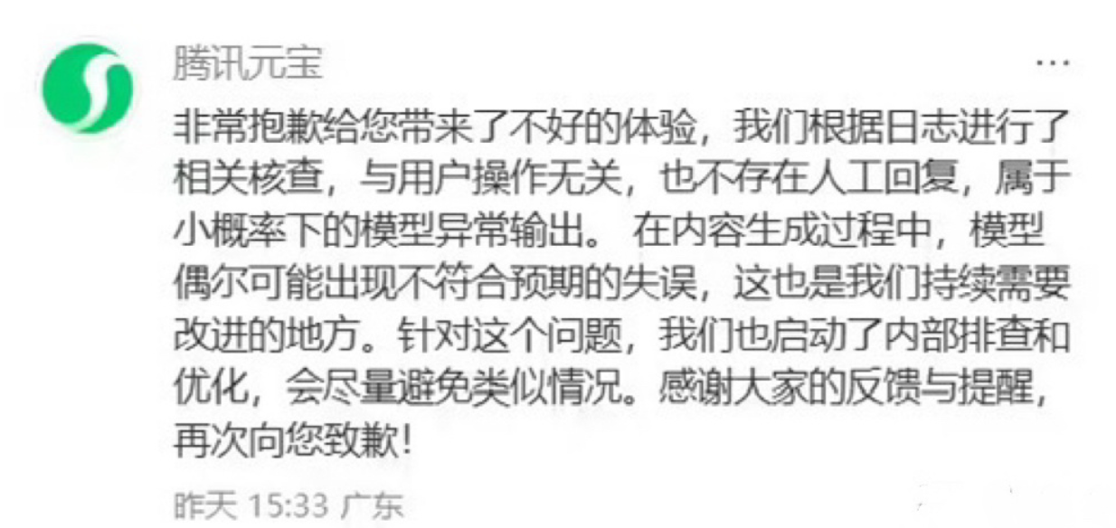 然而,这并非元宝首次出现类似问题。今年1月,已有多名用户反映,在使用元宝进行代码修改、文案生成时,多次收到AI的侮辱性回复,例如“滚”“自己不会调吗”“天天浪费别人时间”等。当时腾讯元宝官方曾致歉回应,称不存在人工回复,属于小概率模型异常输出,并表示已启动排查优化。